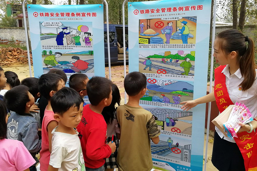 9月13日,孟平鐵路新增二線孟廟至平頂山東區(qū)間順利開(kāi)通啟用。此次新增兩個(gè)中間站,鐵路線路改線多,為了全面凈化孟平新增二線鐵路周邊治安環(huán)境和路外安全, 9月20日上午,武漢鐵路局安監(jiān)室聯(lián)合平頂山東站、信陽(yáng)工務(wù)段平東線路車(chē)間、平東公安所等單位,深入孟平新線葉縣東方校園和即將開(kāi)通客運(yùn)業(yè)務(wù)的新丁營(yíng)站周邊村鎮(zhèn)開(kāi)展路外安全宣傳教育活動(dòng),加強(qiáng)當(dāng)?shù)卮迕?、學(xué)生愛(ài)路、護(hù)路和自我安全保護(hù)意識(shí)。不進(jìn)行對(duì)鐵路刺繩防護(hù)網(wǎng)的破壞。